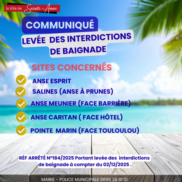 RÉF : ARRÊTÉ N°184/2025 PORTANT LEVÉE DES INTERDICTIONS TEMPORAIRES DE BAIGNADE SUR LES SITES SUSMENTIONNÉS